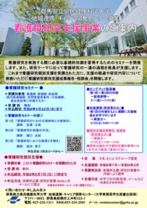 県内の病院、行政機関、健診機関、訪問看護ステーション、福祉施設、事業所等に所属する原則看護師、保健師、助産師を対象に、看護研究を実施する際に必要な研究の基礎的知識を習得するための看護研究セミナーと、研究テーマに沿って看護研究の一連の過程を本学教員が支援する看護研究個別支援を実施し、県内の看護職者の研究活動を支援することで、研究能力の向上と県民の健康の保持・増進に寄与する研究成果の産出を図ります。