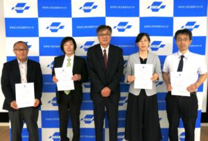 写真は左から原教授、杉野准教授、柏倉学長、富永講師、山﨑教授