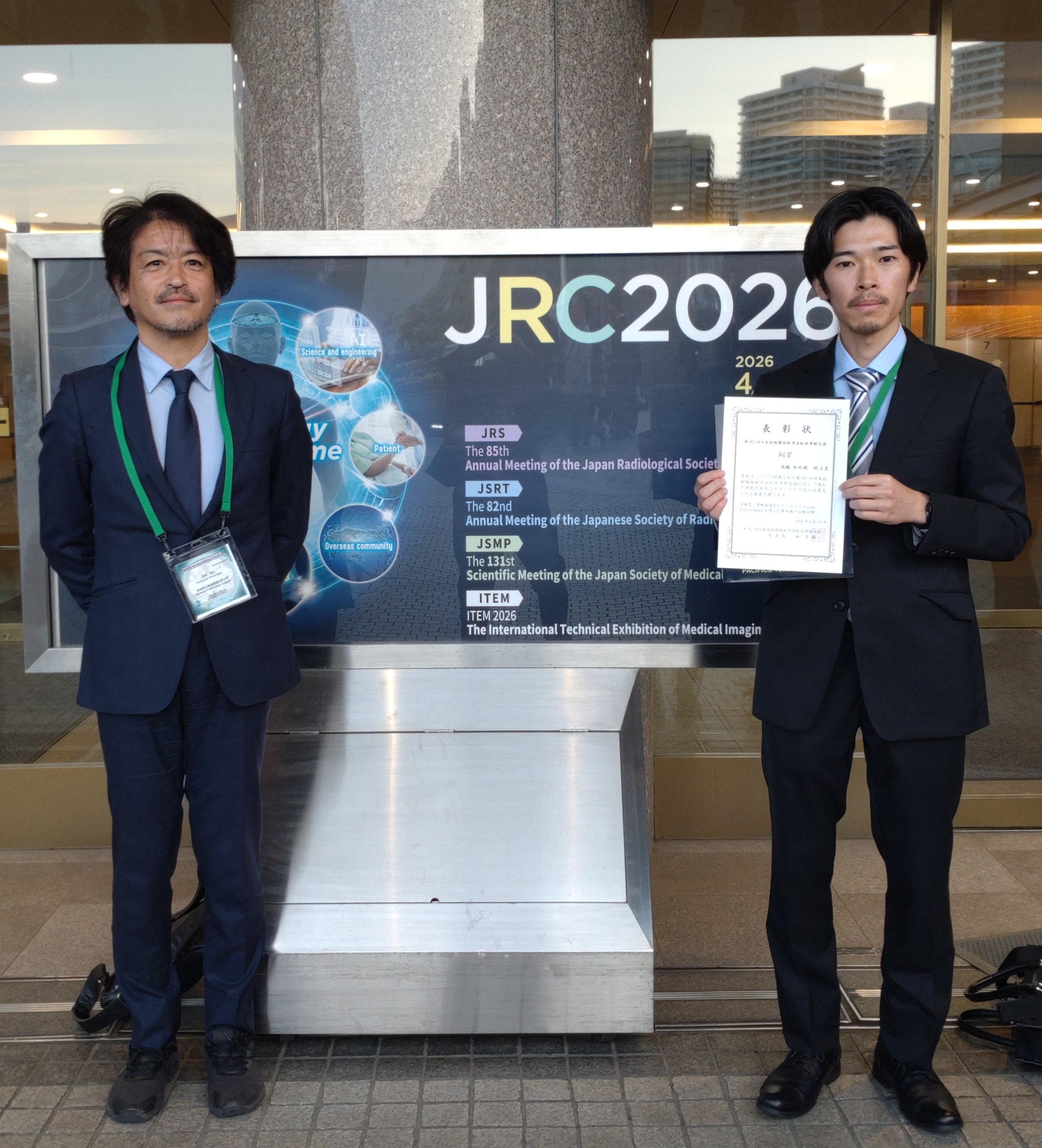令和8年4月,パシフィコ横浜会議センター(神奈川県横浜市)で開催された第82回日本放射線技術学会総会学術大会において,本学大学院診療放射線学研究科博士前期課程2年の髙橋和也さんがCyPos賞銅賞を受賞しました.受賞演題名は,「多断面造影CTにおけるVision Transformerを用いた腎外傷の自動分類」(研究指導:渡部晴之教授)です.CyPos賞は学術的に優れる将来性の豊かな演題に対して授与される賞です.